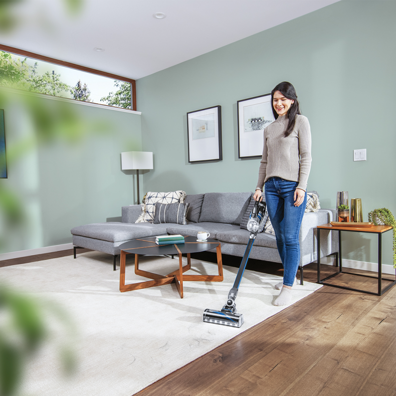 Wbudowane oświetlenie w stopie odkurzacza oświetla kurz i zabrudzenia w ciemnych miejscach, takich jak pod meblami czy w kątach