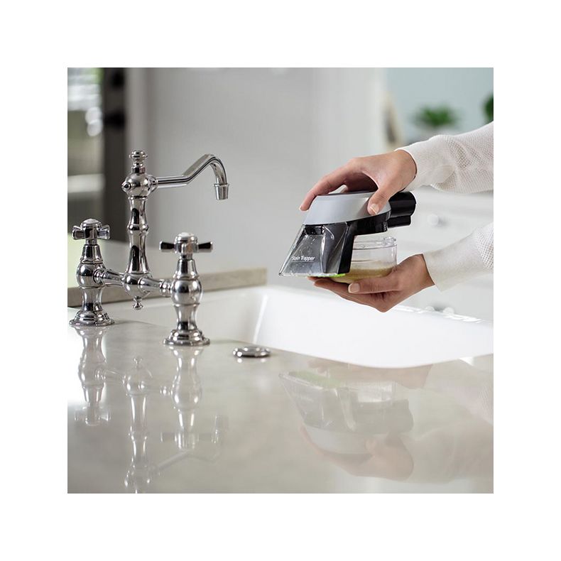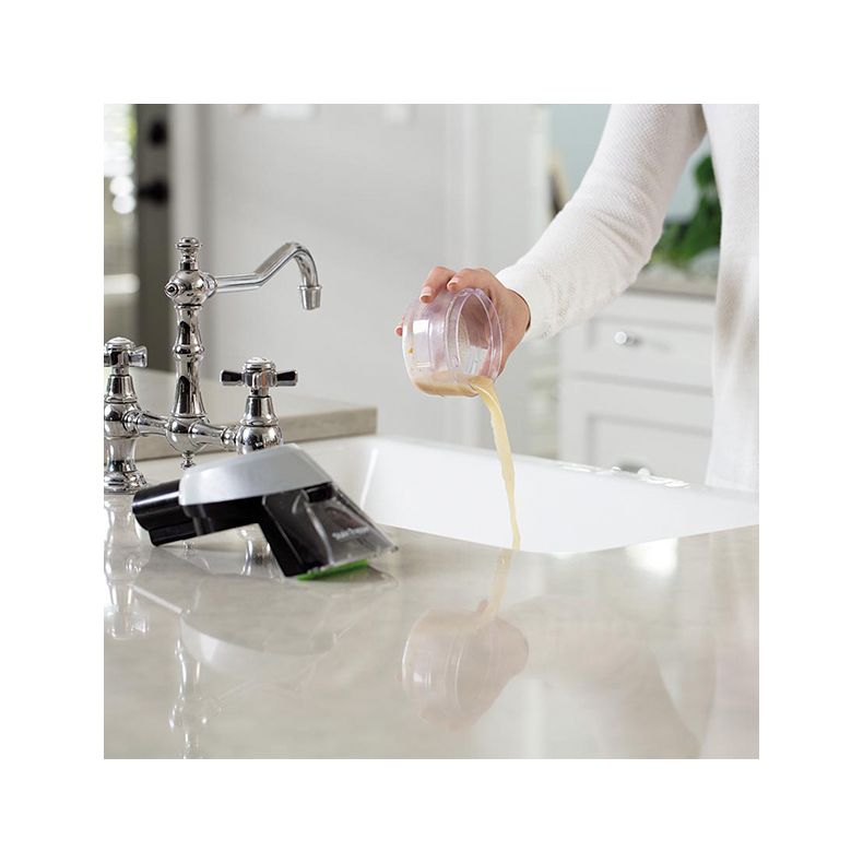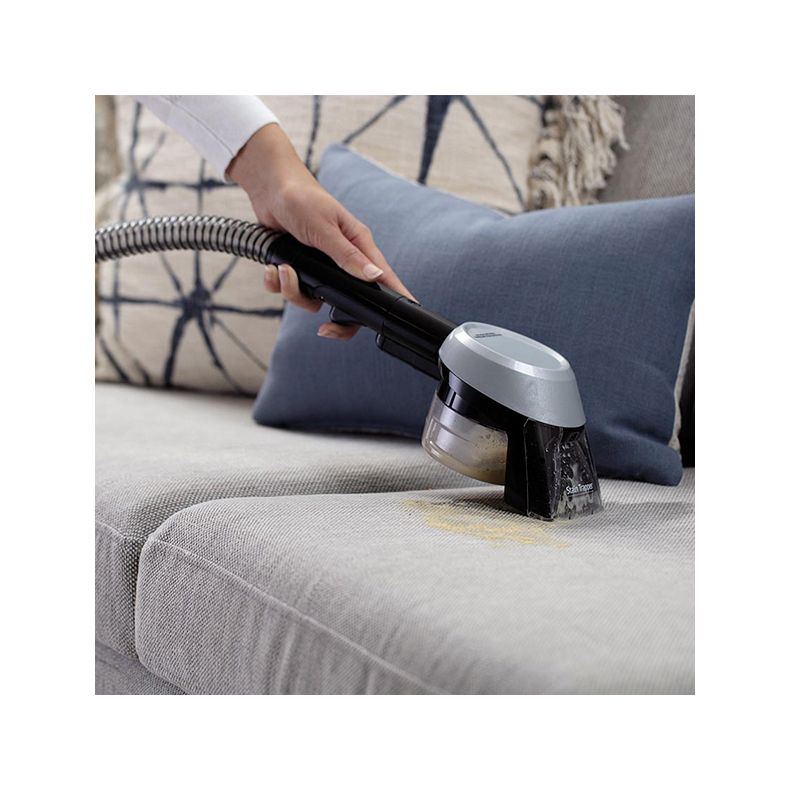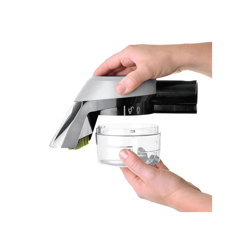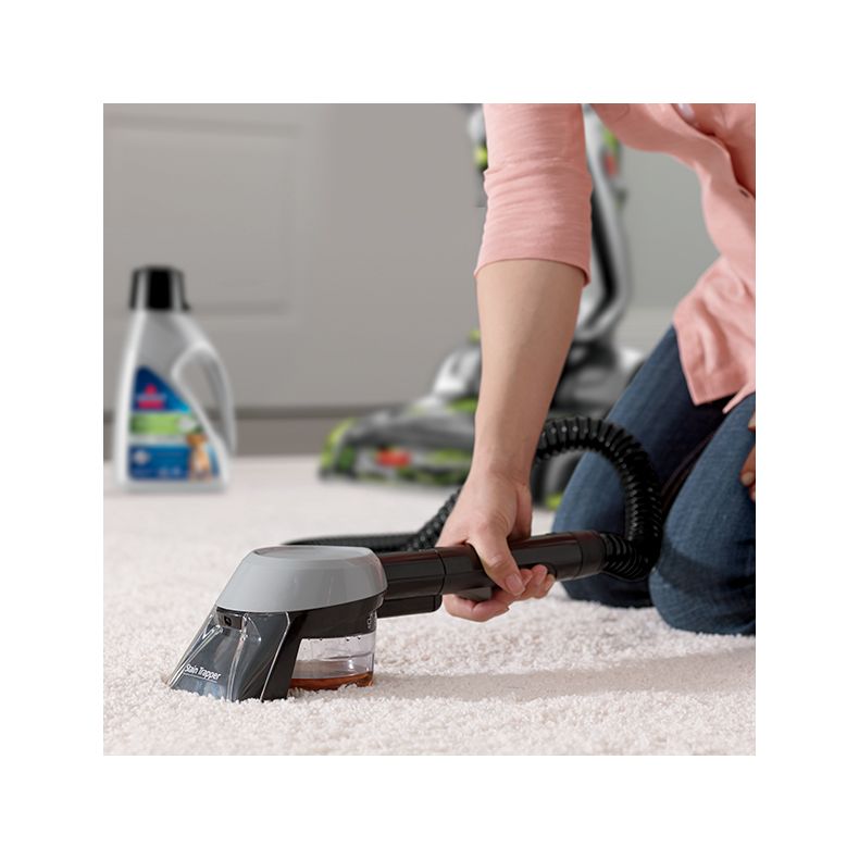 Umieść narzędzie bezpośrednio na usuwanym zabrudzeniu i pociągnij włącznik, aby spryskać plamę roztworem środka do czyszczenia i wody. Zwolnij włącznik i delikatnie szoruj plamę szczotką do momentu całkowitego usunięcia. Narzędzie usunie zanieczyszczenia do oddzielnego wewnętrznego wyjmowanego zbiornika. To pozwoli łatwo opróżnić sam pojemnik na odpady. Brud nie będzie osadzał się na wężu lub w maszynie, dzięki czemu pozostaną one czyste.
