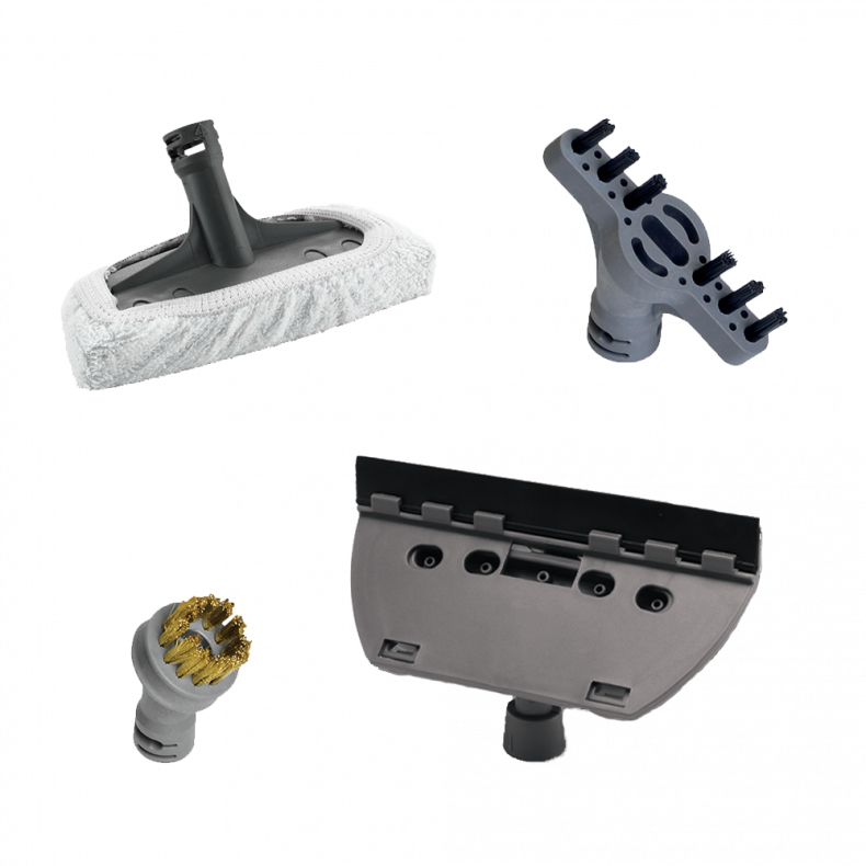 Końcówki te przydają się do mycia okien, prasowania odzieży i zasłon, szorowania fug i kratek kuchenki, a wszystko to z wykorzystaniem pary!